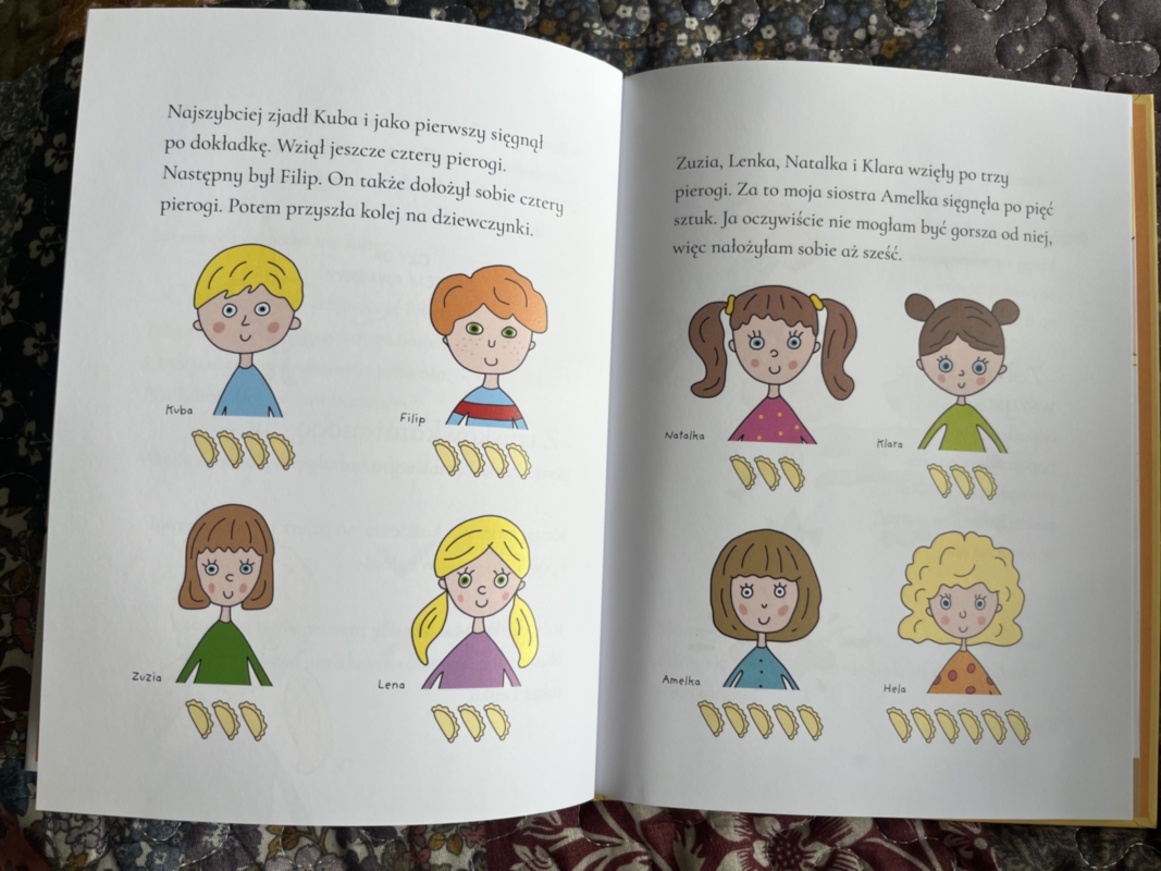 z truskawkami! Ten szczegół szczególnie ucieszył dzieci o bardziej wybiórczych gustach kulinarnych. Każde z dzieci dostaje porcję, ale na jednej dokładce się nie kończy. Amelka – siostra Heli – nakłada sobie więcej, a Hela, nie chcąc być gorsza, postanawia wziąć jeszcze większą porcję. Mimo ostrzeżeń siostry, że może nie dać rady wszystkiego zjeść, dziewczynka trwa przy swoim. Szybko okazuje się, że była to decyzja podjęta bardziej z emocji niż rozsądku. Każdy kolejny pieróg staje się wyzwaniem.