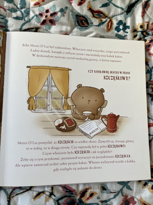 Z sympatycznym bobrem Misterem O’Lui polscy czytelnicy spotykają się po raz pierwszy. To debiut autorki Silke Siefert na naszym rynku książki dziecięcej. Przyznam, że bardzo czekałam na tę książkę – głównie ze względu na jej intrygujący i ponadczasowy tytuł: „Mister O’Lui szuka szczęścia”. Zastanawiałam się, w jaki sposób można opowiedzieć dzieciom o tak abstrakcyjnym pojęciu jak szczęście.