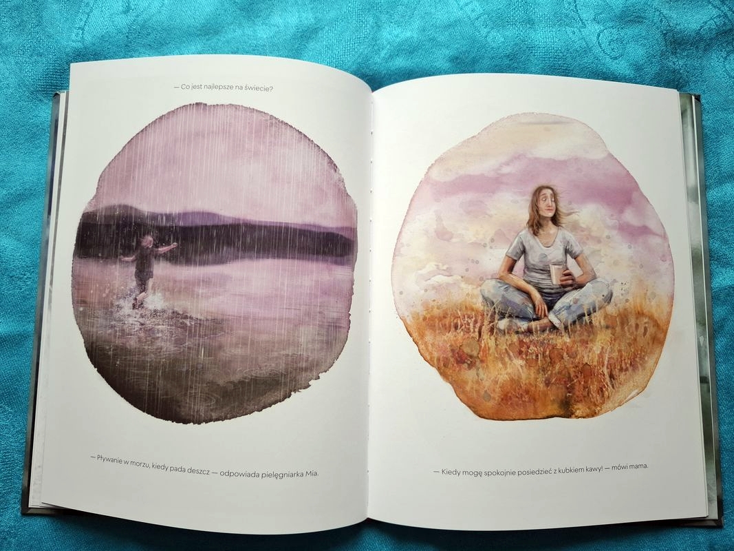Autorka nie boi się podjąć trudnego dla każdego dziecka i rodzica tematu śmierci – bohaterka pyta o to, co będzie później i czy będzie bolało. Najbardziej ujęła mnie myśl pielęgniarki: „Wierzę, że kiedy umieramy, zamieniamy się w ciepłe promienie słońca na niebie i ogrzewamy wszystkich, których kochamy”.