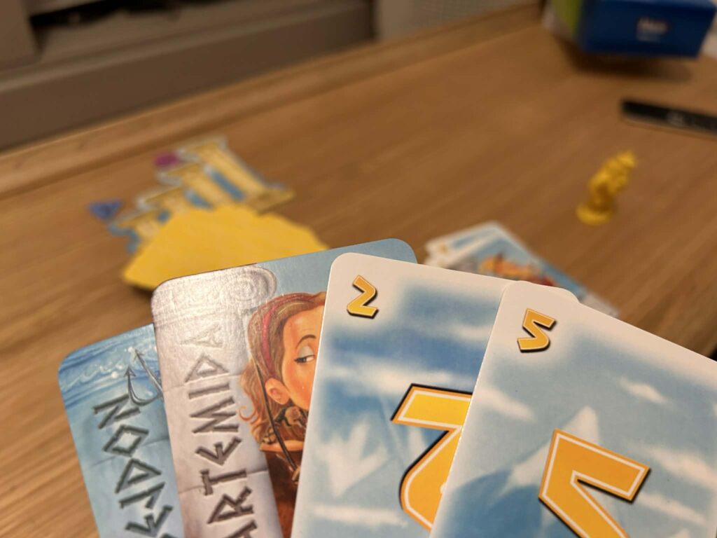 Każdy gracz ma na ręku karty i w swojej turze dokłada jedną z nich na wspólny stos – tzw. Olimp. Karty mają wartości liczbowe, które się sumują. Celem jest doprowadzenie do sytuacji, w której suma osiągnie określony poziom (100), ale… w tym momencie figurka Zeusa musi być w naszych rękach.