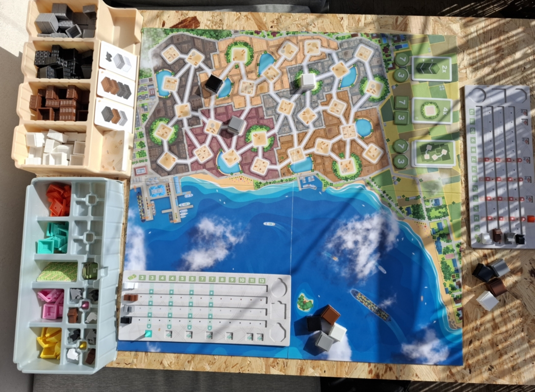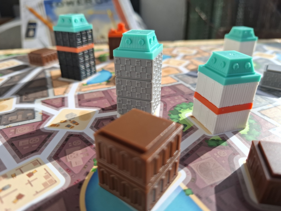 Największym atutem gry jest jej trójwymiarowość. Zamiast płaskich żetonów, na planszy lądują plastikowe moduły budynków, które pną się w górę, tworząc imponującą makietę miasta.